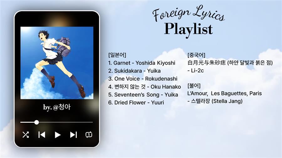 가사가 있는 음악을 듣고 싶지만 한국어 가사가 자꾸 귀에 들어와 거슬린다면, 이 플레이리스트를 추천한다. 외국어 가사는 배경처럼 흘러가 공부에 더 집중할 수 있다 ??
