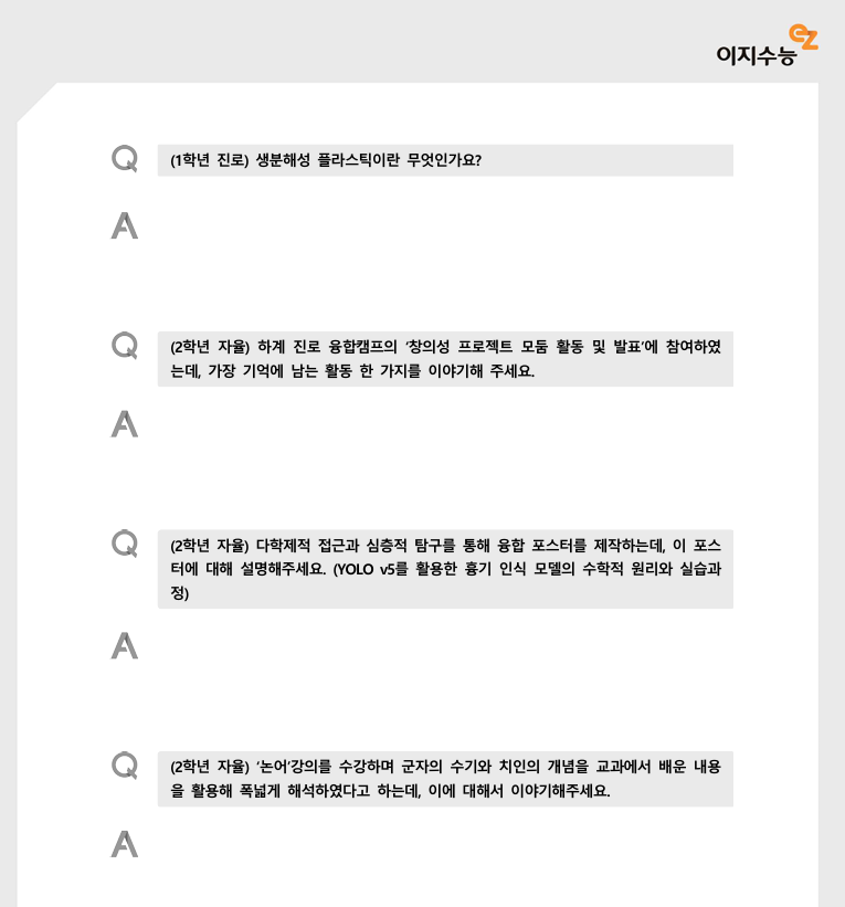 자기소개서에 적힌 활동 하나하나를 꼼꼼히 짚어주셨고, 3년 동안의 생기부를 기반으로 모든 가능성을 고려한 질문이 담겨 있었어요. 덕분에 시간은 부족했지만, 혼자 준비하더라도 방향을 잃지 않을 수 있었습니다.