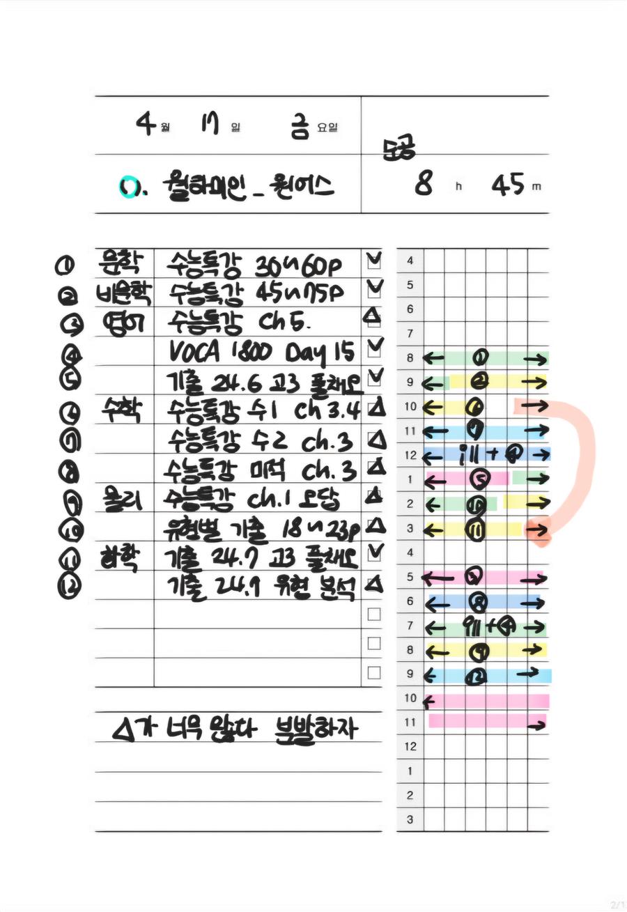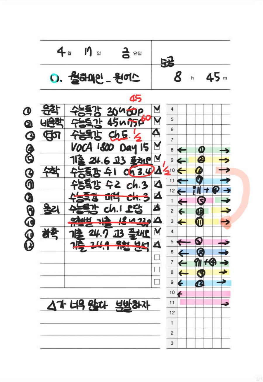 제가 너무 몰두하는 걸 알아챈 건 이지수능교육의 선생님이었습니다. 선생님은 제 플래너를 보시더니 웃으면서 이렇게 말씀하셨습니다.