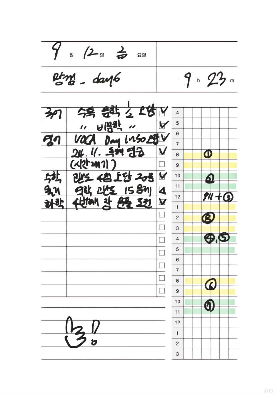 하지만 그날 공부할 분량을 적고, 저녁에 그 칸을 체크하면서 ‘이건 해냈다’는 표시를 하는 것만으로도 신기하게 마음이 정리되는 기분이 들었습니다. 공부 자체보다도 ‘해냈다’는 기록에 의지하면서 하루를 버티게 된 거죠. 그러다 보니 점점 플래너 작성이 좋은 의미의 중독처럼 제 삶에 자리 잡게 되었습니다. 결국 이 습관이 저만의 안정적인 수능 루틴으로 자리 잡았습니다.